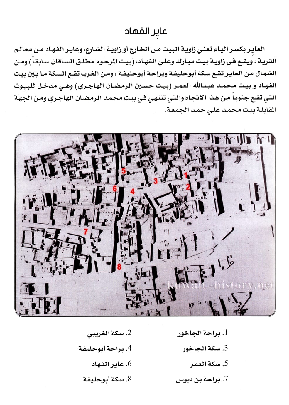 العايِر بكسر الياء تعني زاوية البيت من الخارج أو زاوية الشارع، وعايِر الفهاد من معالم القرية، ويقع في زاوية بيت مبارك و علي الفهاد، (بيت المرحوم مطلق الساقان سابقاً) ومن الشمال من العاير تقع سكة أبوحليفة وبراحة أبوحليفة، ومن الغرب تقع السكة ما بين بيت الفهاد و بيت محمد عبدالله العمر (بيت حسين الرمضان الهاجري) وهي مدخل للبيوت التي تقع جنوباً من هذا الاتجاه والتي تنتهي في بيت محمد الرمضان الهاجري ومن الجهة المقابلة بيت محمد علي حمد الجمعة. توجد خريطة مرفقة توضح بعض معالم قرية أبوحليفة القديمة. المصدر: قرية أبوحليفة بين الموروث و المراجع التاريخية؛ للباحث الأستاذ: فهد محمد الجابر. ملف مرفق 1821 |