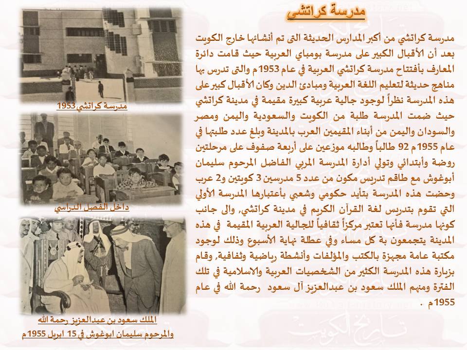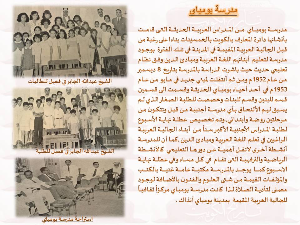 مدرسة بومباي ومدرسة كراتشي في عام 1936م تم تشكيل أول مجلس للمعارف بالكويت بغرض تنظيم التعليم ووضع الخطط اللازمة لمواكبة التعليم في دول العالم فقامت المعارف ببناء المدراس بالكويت واستقدام المعلمين وأبتعاث الطلبة للخارج فلم يقتصر دور المعارف على بناء المدارس بالكويت فقط بل أمتد الى خارج الكويت حيث قامت بأفتتاح أربعة مدارس للبنين والبنات خارج الكويت في مدينة كراتشي و ومدينة بومباي وفي الشارقة و راس الخيمة لتعليم اللغة العربية ونشر التعليم والثفافة في تلك المدن حسب المناهج التعليمة المتبعة بالكويت في تلك الفترة حيث بلغ عدد طلبة تلك المدارس في بداية أفتتاحها 400 طالباً في مختلف المراحل ومن أهم تلك المدارس هي مدرسة بومباي ومدرسة كراتشي . ملف مرفق 1723 ملف مرفق 1724 جمع وأعداد المشرف PAC3 المصدر بتصرف :سجل الكويت اليوم .يناير 1956م حقوق النسخ محفوطة للكاتب PAC3 ولمنتدى (تاريخ الكويت)، أرجوا عند النقل ذكر المصدر (للكاتب PAC3 من منتدي تاريخ الكويت www.kuwait-history.net) . |