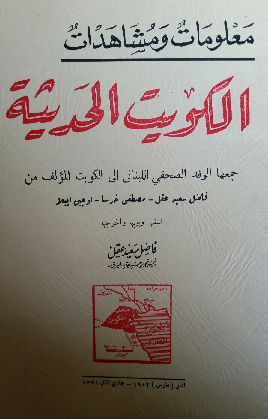 كتاب معلومات ومشاهدات الكويت الحديثة. تأليف وفد صحيفة البيرق برئاسة فاضل عقل. نشر في لبنان سنة 1952.