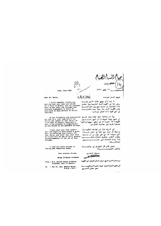 وثيقة انجليزية عبارة عن رسالة تهنئة أرسلها الشيخ صباح السالم الى صديقه الانجليزي ادوارد هيث ( 1916م ــ 2005) رئيس حزب المحافظين البريطانيين يهنئة فيها بمناسبة فوزه في عضوية البرلمان البريطاني عام 1970 م , تكشف رسالة التهنئة الى عمق الصداقة التي جمعت بين حاكم الكويت الشيخ صباح السالم والسيد ادوارد هيث قبل توليه ادارة الحكم في البلاد في اشارة الى عمق العلاقات الكويتية ــــ البريطانية , ومن الجدير بذكره ان ادوارد هيث قد اصبح رئيس لوزراء بريطانيا في الفترة 19 يونيو 1970 ـــ 4 مارس 1974م , وقد نشرت جريدة القبس هذه الرسالة بتاريخ 27 / 4/ 2001م