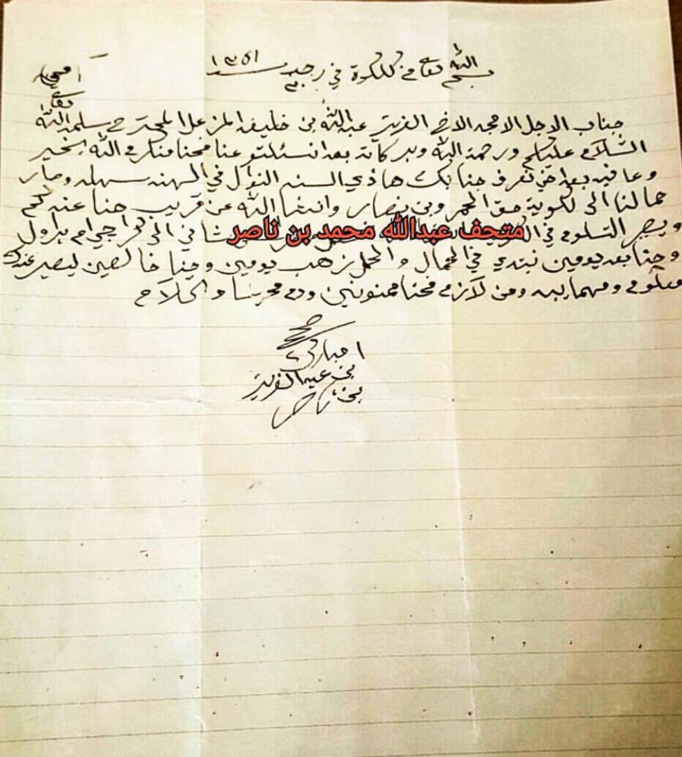 مكتوب بخط النوخذه مبارك عبدالعزيز محمد بن ناصر رحمه الله من كلكوة الى الكويت ،بخصوص تحميل بضائع على المحمل من الهند ويذكر انه سوف يكون التسليم في الكويت مؤرخه سنة ٣٠ رجب ١٣٥١هجري الموافق ٢٨ نوفمبر 1931ميلادي .