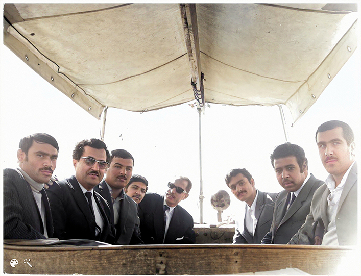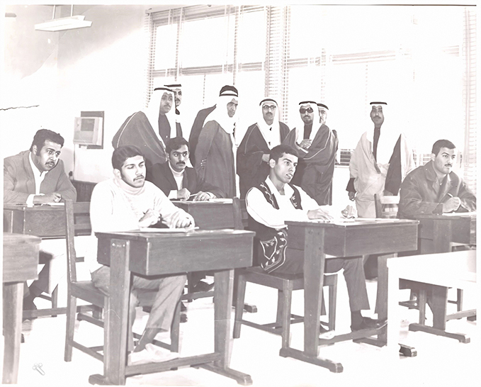 يظهر في الصورة من اليمين فيصل المخيزيم ونخيلان النخيلان ومهدي بهبهاني ومن اليسار يونس بارون والأستاذ خالد عيد وعلي سعود المطرود ورضا دشتي الصورة في أواخر الستينات