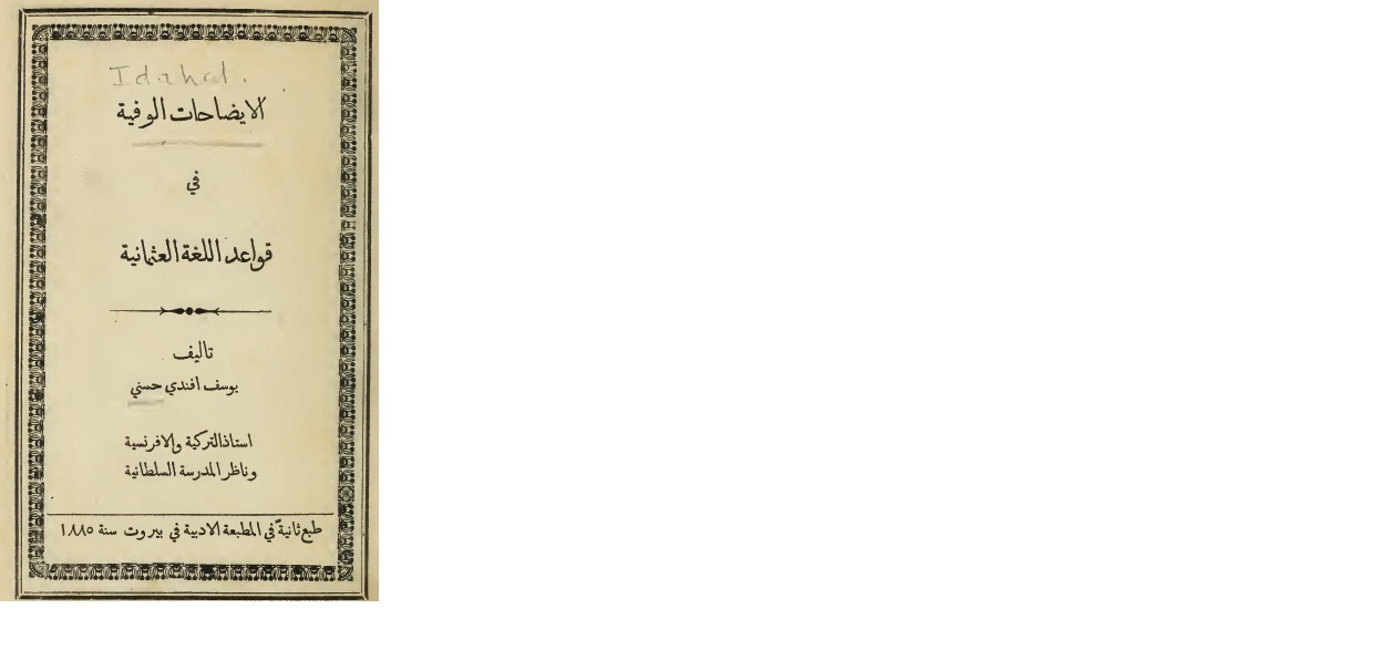اضغط على كتاب الايضاحات الوفية في اللغه العثمانيه تاليف يوسف افندي حسن استاذ التركيه والافرنسية وناظر المدرسه السلطانيه في الدوله العثمانيه طبع عام 1885م وانتهت حقوق الملكيه ونشر على موقع اركايف بواسطة جامعة تورنتو