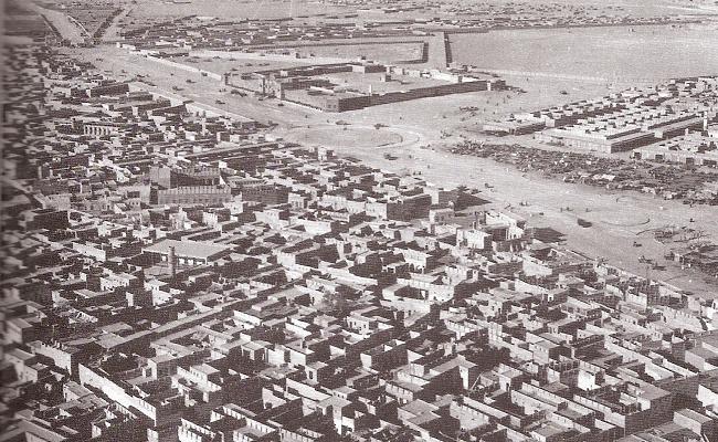 صورة تعود لأواخر الخمسينات ويبدو فيها جزء من الشامية وعمارة ثنيان الغانم وذلك بعد ازالة السور بالكامل
