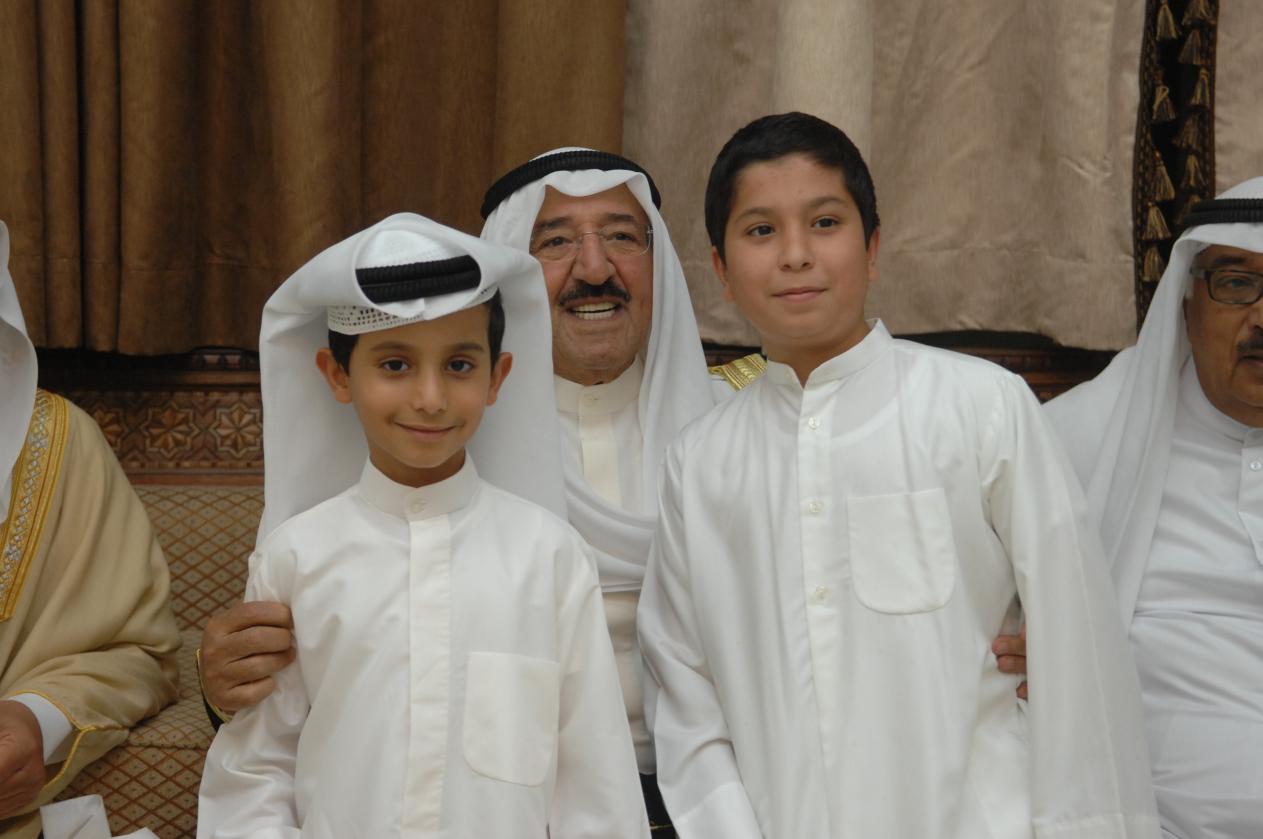 وهذي صورة أبوية رائعة لصاحب السمو أمير البلاد الشيخ صباح الأحمد الجابر الصباح مع أطفال من عائلة المسباح وهم يستقبلونه بديوان خالد بن مسباح بالشعب في عرس "عمر" نجل فضيلة الشيخ ناظم محمد بن سلطان المسباح قبل يومين ، وهم من اليمين (أحمد وائل المسباح و عثمان مهند المسباح).