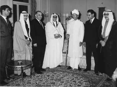 صوره جماعية مع الشيخ عبدالله الجابر الصباح لدى زيارة الوفد الكويتي رئيس الجمهورية الهنديه
