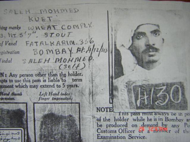 تحياتى لرواد صفحتكم المباركة ويشرفنى ان اكون عضوا فى هذا الموقع الجميل الذى يخلد التاريخ الكويتى وبما اننى ابن احد النواخذه الذين ورد ذكرهم فى موقعكم الكريم فيسرنى ان اساهم معكم فى سرد تاريخ والدى النواخذا صالح المهينى ويسعدنى ان ابدا معكم بسرد قصة تموين الكويت الاول والذى حدث ابان الحرب العالمية الثانية حيث شح على الكويتين العيش والرزق لعدم وصول الموانى الى الكويت فأمر الشيخ احمد الجابر رحمه الله السفن الكويتية المتواجده خارج الكويت بجلب التموين الى الكويت فامر الشيخ احمد الجابر والدى والنوخذا النشمى بجلب تموين الكويت وكان لهذا الحدث قصة كبيرة سأوافيكم بها واهديكم هذه الصورة لوادى فى تلك السنة حيث امرت الهند جميع السفن بحمل هويات لتتمكن من العبور وفى الحلقة القادمة اسرد لكم قصة تموين الكويت .... اخوكم خالد صالح المهينى مدرس التربية الاسلامية بالمدرسة البريطانية بالكويت