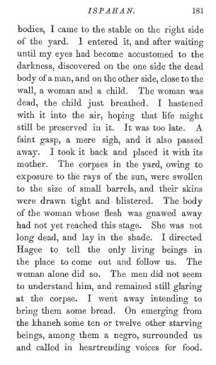 · ذكر الرحاله الانجليزي ويليام برتل بانك في مؤلفه : بلاد فارس أثناء المجاعة