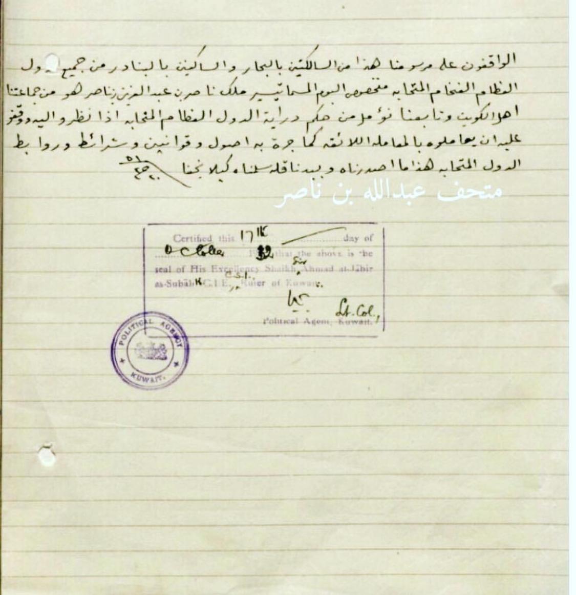 الواقفون على مرسومنا هذا السالكين بالبحار والساكينين بالبنادر من جميع دول العظام المتحابة بخصوص البوم المسماه تيسير ملك ناصر بن عبدالعزيز بن ناصر هو من جماعتنا اهل الكويت وتبعنا نؤمل من حكم دارية الدول العظام المتحابة اذا نظرو اليه ووقفو عليه ان يعاملوه بالمعاملة اللائقة كما جرة بسن أصول وقوانين وشرائط وروابط الدول المتحابة هذا ما اصدرناه وبيد ناقله سلمنا كيلا يخفى