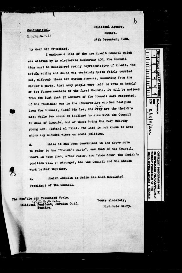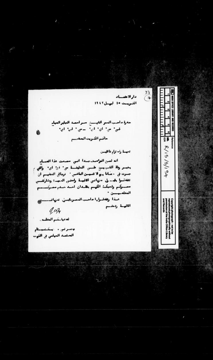 رسالة من المعتمد السياسي في الكويت للشيخ أحمد الجابر الصباح في عام 1942 يطمئن فيه عن صحة الشيخ بعد العارض الذي ألم به ويلاحظ كيف أن المعتمد يعتذر للشيخ لعدم زيارته بسبب رفض الشيخ استقبال الزوار