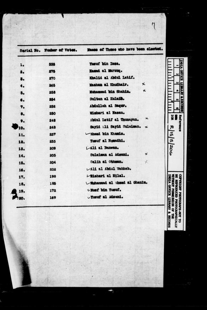 هذه الوثيقة تبين نتائج انتخابات المجلس التشريعي الثاني التي جرت في 27-12-1938 لاختيار أعضاء المجلس التشريعي الجديد، وقد زاد عدد الناخبين إلى 400 وعدد الأعضاء إلى 20، وجرت الانتخابات بشكل نزيه وقد أظهرت النتائج إعادة انتخاب جميع أعضاء المجلس السابق فضلاً عن خمسة من مؤيديهم، وهؤلاء حازوا على المراتب ال 17 الأولى، فيما حل ثلاثة من المعارضين للمجلس السابق في المراكز الثالثة الأخيرة، وأعيد انتخاب الشيخ عبد الله السالم رئيساً للمجلس التشريعي الثاني