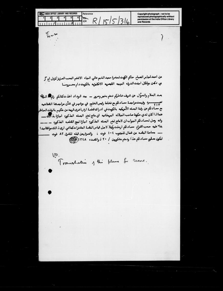 وثيقة توضح مشاورة الشيخ أحمد الجابر الصباح عام 1930 للبريطانين بشأن بيع قطعه أرض للبعثة الأمريكية