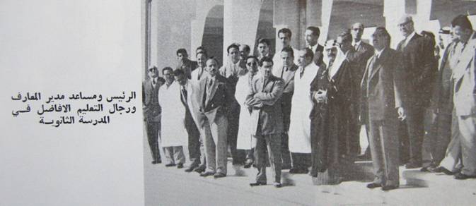 أمام الثانوية - الشويخ - 1955 و يبدو المرحوم الشيخ عبد الله الجابر و المرحوم عبد العزيز حسين و الكادر التعليمي ... للثانوية ..
