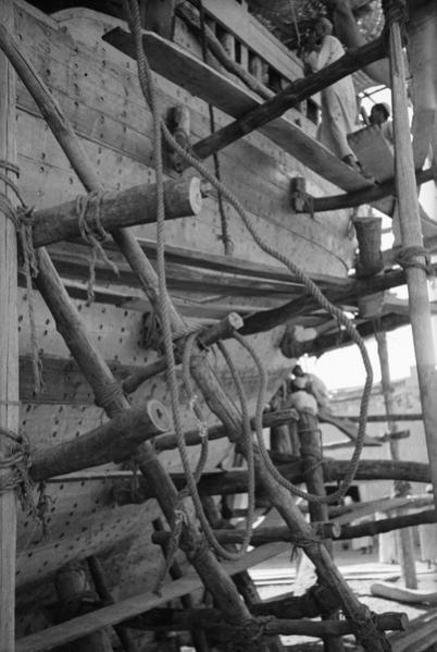 أجزاء السفينة تتكون السفن الشراعية من أجزاء خارجية والتي تشكل الهيكل الخارجي وأجزاء داخلية والتي تشكل الهيكل الداخلي للسفينة ومن ظمنها السطح ولكي نتعرف عليها سوف اذكر الأجزاء الخارجية المكونة من الهيكل الخارجي للسفنية ثم الأجزاء الداخلية المكونة من الهيكل الداخلي ومن ظمنها السطح . الجزء الخارجي "الهيكل الخارجي": يتكون الجزء الخارجي للسفنية " الهيكل الخارجي" من التالي : · بيص السفنية " البيص" : وهو العمود الفقري للسفينة وقاعدتها وهي كلمة عربية وتعني الشدة أو الشي الذى لامحيص عنه والبيص هو الأساس الذي يبداء به عند بناء أي سفينة شراعية وهيكلها ومن البيص يكون غاطس السفنية وهو الجزء المغمور من السفينة في حال ابحارها . · ميل صدر : وهو صدر السفنية ومقدمتها. · ميل تُفرْ : وهو مؤخرة السفنية . · المالك ( المالج ) : وهو لوح من الخشب يمتد فوق البيص" القاعدة". · الخد : وهو اللوح التي يأتي بعد المالج مباشرة . · البرميل: يضع فوق " الميل " للحفاظ عليه . · الداعومة : توضع على رأس البيص عند " ميل صدر " لحفظة من الأصتطدام . · الكمر : لوح خشبي سميك في منتصف هيكل السفينة لحزمها . · القيطان : لوح خشبي يوضع فوق الكمرة المحيط بهيكل السفينة. · المنظرة : لوح خشبي يقع بين " الكمرة " والقيطان " . · التريك ( التريج ) : اخر لوح في هيكل السفينة ويقع على حافتها . · الزبدرة : مجموعة الألواح وتقع على جانبي السفنية ( فنة التفر ) . · الحجاب ( الحياب ) : الجزء الأمامي من مؤخرة السفنية . · العالية : الجزء الأمامي من مؤخرة السفينة . · الجلد: الجزء الأسفل من مقدمة ومؤخرة السفينة . · القائم( القايم ) : لوح عمودي الشكل يقع في مؤخرة السفينة . · الكلب " الجلب": ضلع خشبي في مقدمة السفينة . · الخيسة "التعراضة " : هي أضلاع خشبية بارزة في مؤخرة السفنية وتستخدم في ربط علم السفنية وحبال الشراع وسند "الفرمن " الكبير والصغير . اجزاء السفينة الداخلية وسطحها: تتكون إجزاء السفينة الداخلية وسطحها من التالي : · صور الدقل " الدكل " : هو المراكز التي يستند عليها الدقل الكبير . · الصوراي : مجموعة من الأخشاب مختلفة الحجم تمتد من مقدمة إلى مؤخرتها لرفع ألواح السطحة . · المشابات : فتحات يتم تثبيت صاري السفينة وله استخدام اخر في إدخال السلع المختفلة. · العوبيدار ( العبيدار) : بكرة خشبية ثابتة تستعمل لرفع الشراع . · ألواح السطحة : هي ألواح خشبية تشكل فيما بينها سطح السفينة . · الفح : حزام السفنية الداخلي وموقعة في منتصف السفنية . · الدبوسة : مخزن لحفظ المؤن يقع في مؤخرة السفينة وكذلك يخزن به متعلقات السفينة كالاشرعة الأضافية وغيرها . ·صور النيم وألواحها : هو الجزء الواقع في مؤخرة السفينة وخلفة يقع الدبوسة . · كشتيل صدر : مكان في صدر السفينة المقدمة وذلك لحمايتها من الأمواج وذلك عن طريق المزاريب المثبتة بها . · حجاب ( حياب ) : لوح أمامي من الخشب يقع فوق كشتيل الصدر لمنع تسرب المياه. · جالي : غطاء خشبي يستخدم لتغطية " الجامرة " ومنه "جالي صدر" وبعد ظهور المكائن ظهر " جالي المكائن " . · شلمان : جمعها "شلامين " وهي إضلاع خشبية تستند عليها الألواح الخارجية للسفينة. · عطفة : وهي إضلاع خشبية مقوسة الشكل تأخذ شكل السفينة وتسند إضلاعهها الخشبية . · كروة : إضلاع خشبية على شكل زوايا تقع في صدر السفينة . · حزام: والجمع منها "حزم " وهي ألواح خشبية سمكية ومستطلية الشكل تمتد على طول السفينة للتثبيتها . · فلس : قاعدة خشبية يرتكز بها الدقل " صاري السفينة " . · الغول : كتل خشبية مساندة للفلس كما انها دعائم لحمل النعش . · جلنكة: اضلاع خشبية لتثبيت جسم السفينة . · عقرب : اضلاع خشبية تربط العنج الأيمن والأيسر حتي يصبحا على شكل حزام للسفنية . · الرقعة : تقع في مؤخرة السفنية وتعرف أجزاؤها بالرًيل , العناقة , وردة , الميل التفري وطرف البيص , النثية . المنحاز. · المقر: يقع في موخرة السفنية وهي فتحة صغيرة لتفريق الماء الذي بداخلها ويتم إغلاقة بخشبة " اصجاجة " . · السكان " الدفة " : ويستخدم لتغير سير وخفض سرعتها ويتكون من التالي : 1) . ر