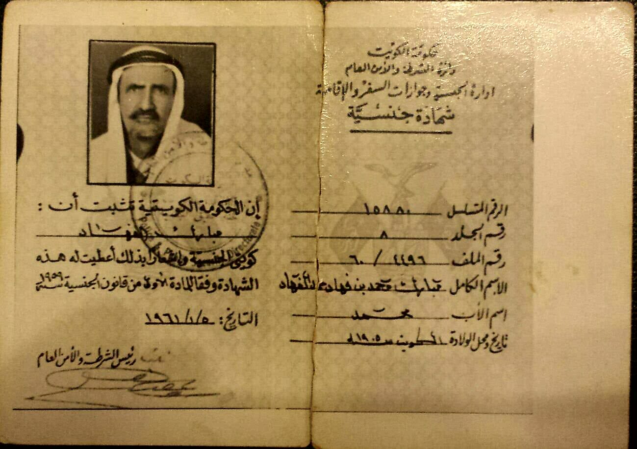 جنسية المرحوم بإذن الله تعالى" مبارك محمد الفهاد " من مواليد أبوحليفه عام 1905م وقد كان عزالًا (غيص على نفقته الخاصة) وقد امتلك رحمه الله حلال (أغنام) بأعداد كبيرة لم يضاهيه فيها أحد من سكان قرى الساحل، وكان يودعها عند معارفه من البدو في البر. |