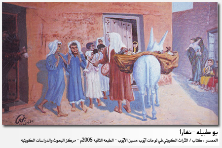وأيضــا يشترك أبو طبيلــة بليالي القرقيعان بالسابق و يطوف بالأحياء والفرجـان التي يتردّد عليها في الأسحار ويجمع القرقيعان ومعه حمار عليه ( وجر ) ويغني أغاني قرقيعان وإذا تباطـــأ القرقيعان وهو واقف عند باب البيت يقول : ( يسوق الحمار لو ما يسوق ) يعني بتعطوني قرقيعان أو لا ... حتي يروح بيت أخـــر :( وبالعشر الأواخر من شهر رمضان ( وقت زكاة الفطر ) يقوم أبو طبيله بالـــمرور عالبيوت ولكن بالنهار وذلك جمع رزقــته من الناس الذين خدمهم في ليالي رمضان وللحصول أيضاً على زكاة الفطره وتلك الايام كانت عباره عن القمح أو التمر أو الرز أو النقود ( كل من ومده أيده ) وأثناء طـــوافه يتــبعـه ســرب ( ساتول ) من الأطفال الصغار ويردّد أبو طبيله و يقــول : (عادت عليكم) .. ويرد علــية الأطفال ( والشر ما يجيكم ) هالدعــاء طبعا لهــل المنزل وهي دعوة طيبه من أبو طبيله بأن يعود عليهم الشهر الفضيل شهر رمضان ... وهم بـــأتم صحه وعافيه من العايدين الفايزين بجنة الرحمن سبحانه |