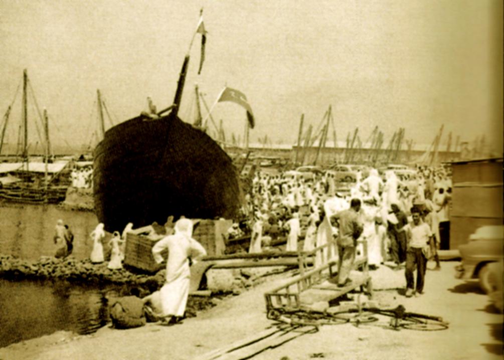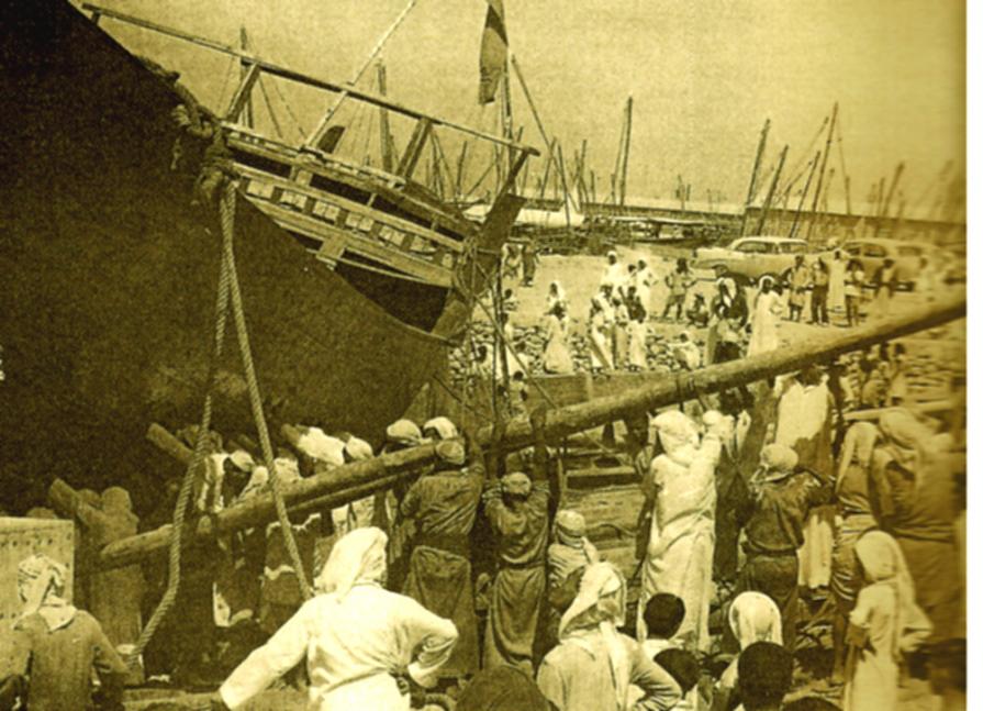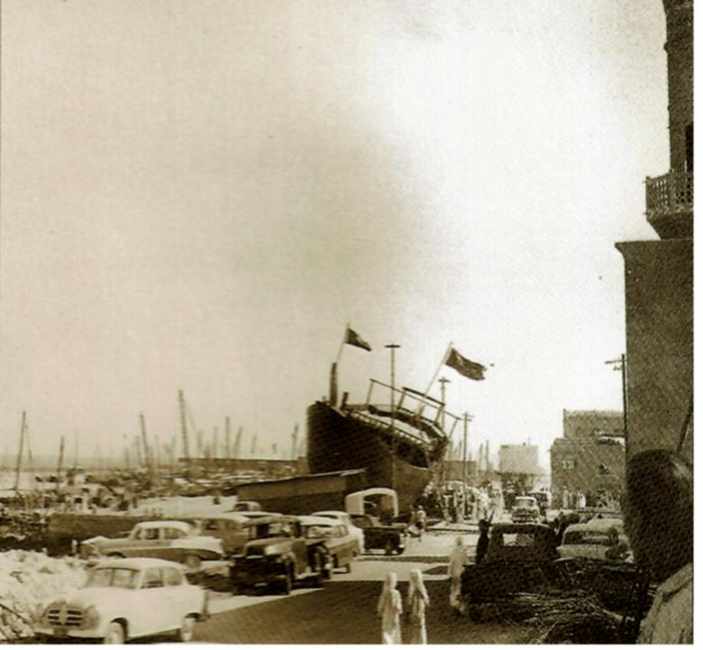 في أغسطس عام 1956 التقطت هذه الصور الجميلة لعملية إنزال بوم المرزوق إلى البحر - أظن نقعة الخرافي - .. وقد سمعت أن هذا آ خر بوم تم إنزاله بهذه الطريقة القديمة .. ويلاحظ في الصور مسجد الخالد ، والمخازن التابعة للجمرك البحري بجانب قصر السيف تصوير : سعود خالد المرزوق المرجع :The Art of Dhow-building in Kuwait |