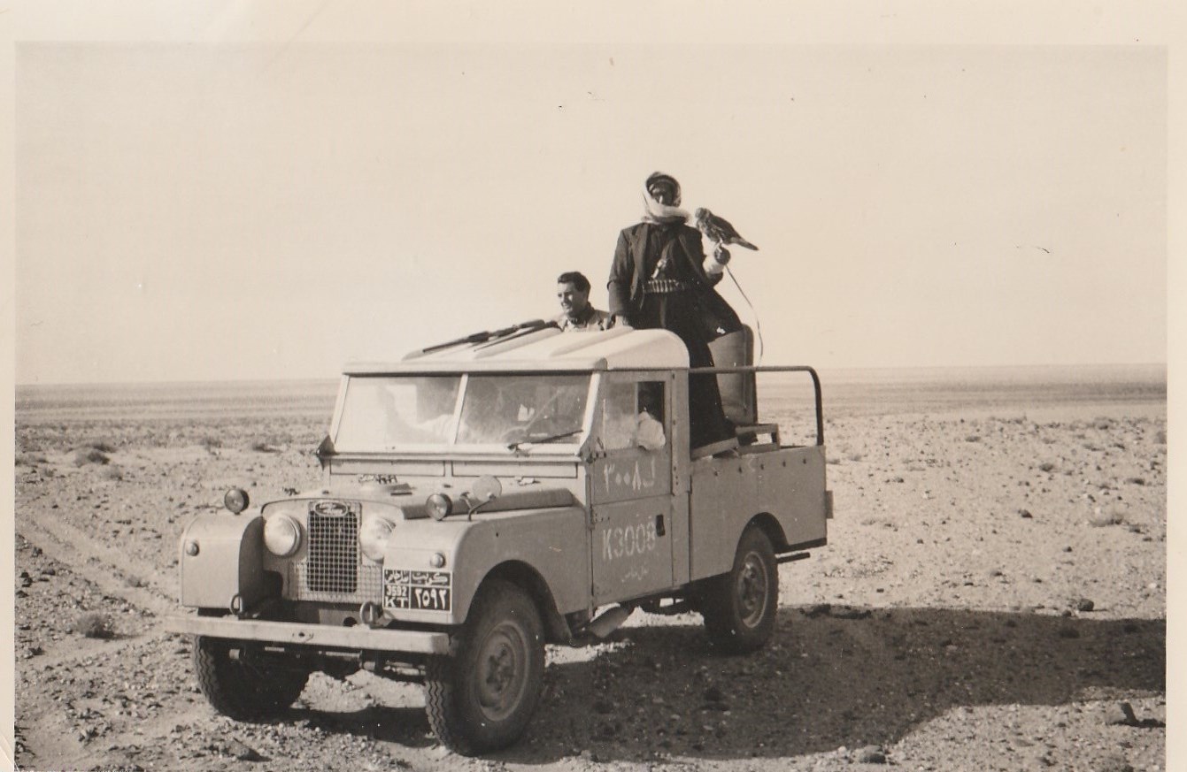 الصورة من بادية الكويت عام 1960 و يبدو في الصورة مواطن كويتي و أحد الموظفين الأجانب و بعض المرافقين ...في رحلة لصيد الحباري في سيارة لاندروفر صديقة الصحراء ....