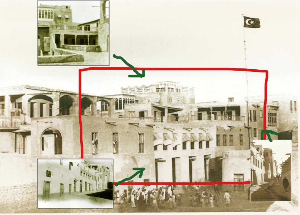يلاحظ في آخر الصورة البنيان ذو الأقواس حيث الجانب الغربي لقصر السيف كما في الصورة التالية