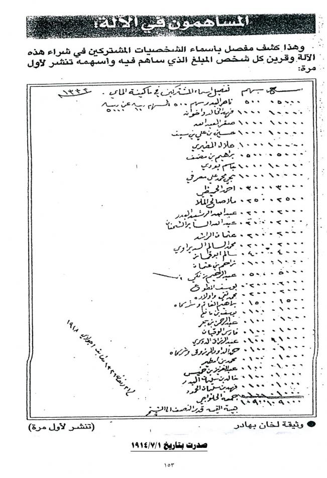 افتراضي كشفا مفصلا بآسماء الشخصيات المشتركة في شراء آلة تقطير المياه 1914 م