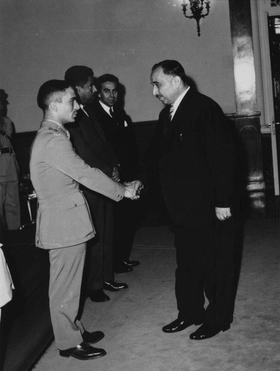 زيارة الملك سعود المدرسة العربية في كراتسي بتاريخ 15\4\1955 يتحدث مع المرحوم الدكتور سليمان أبوغوش ناظر المدرسة.