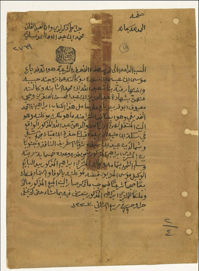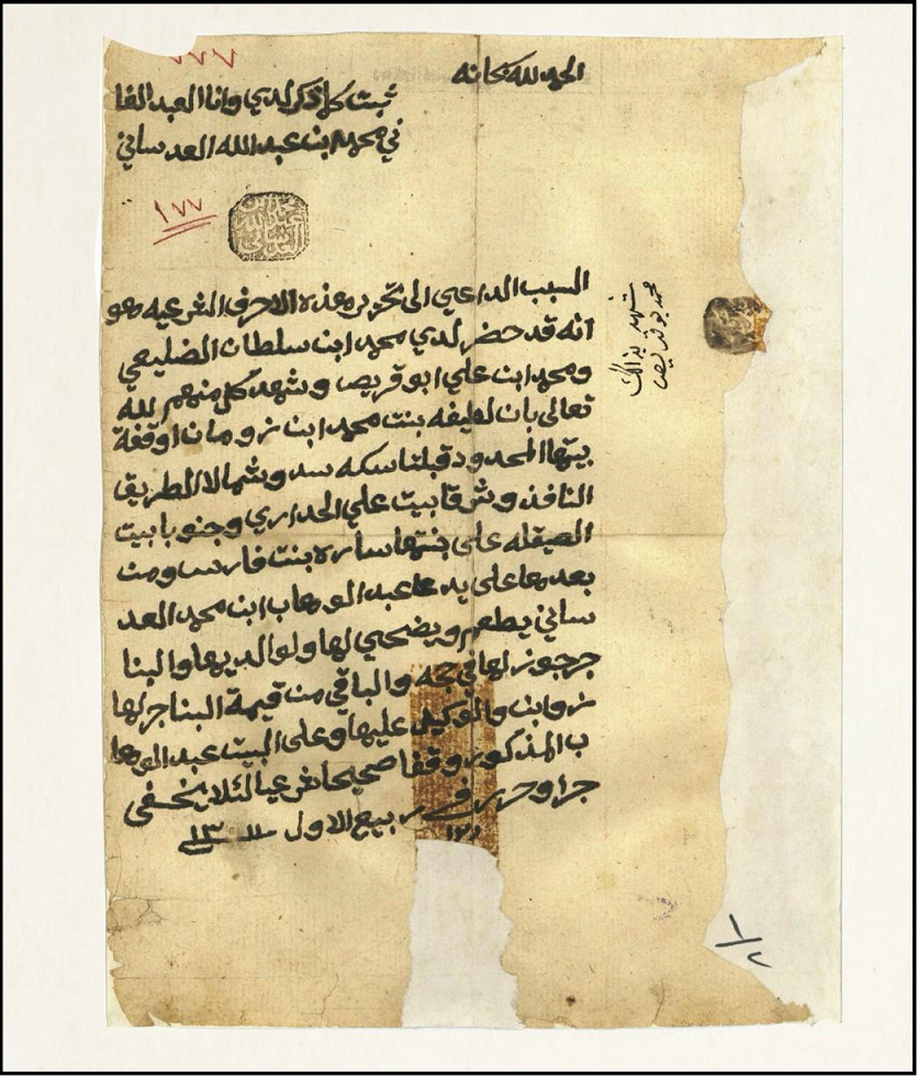 والمملوك لمبارك بالشراء من علي بن عثمان (العيناتي)، وهو دكان من بيته، بموجب الوثيقة المؤرخة 4 رجب 1334هـ (1916/5/6م).»