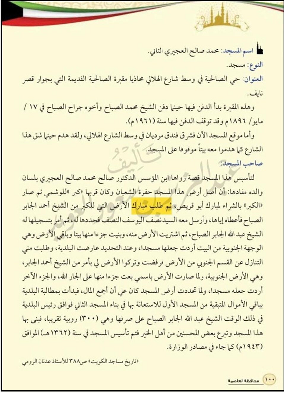 من تاريخ مساجد الكويت القديمة للأستاذ عدنان سالم محمد الرومي يذكر مسجد محمد صالح العجيري الثاني الأرض تم شراؤها من مبارك بن محمد بوقريص وأصل الأرض المسجد حفرة الشعبان وكان قربها " كبر " للوشمي ثم صار " الكبر " بالشراء لمبارك أبوقريص ، ثم طلب مبارك بوقريص الأرض التي للكبر من الشيخ أحمد الجابر الصباح فأعطاه إياها ، وأرسل معه السيد نصف اليوسف النصف فحددها له ، ثم أمر بتسجيلها له الشيخ عبدالله الجابر الصباح ثم أشترى محمد صالح العجيري الأرض من مبارك بوقريص