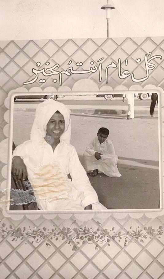 الصورة الأولى هي للوالد (المرحوم بإذن الله تعالى) مساعد يوسف عبدالهادي الميلم، ونلاحظ بأن المصور نقل أستوديو التصوير الى الشارع حيث وضع أطار ويجلس الشخص خلف الأطار لأخذ صورته (الأطار مكتوب عليه كل عام وأنتم بخير).