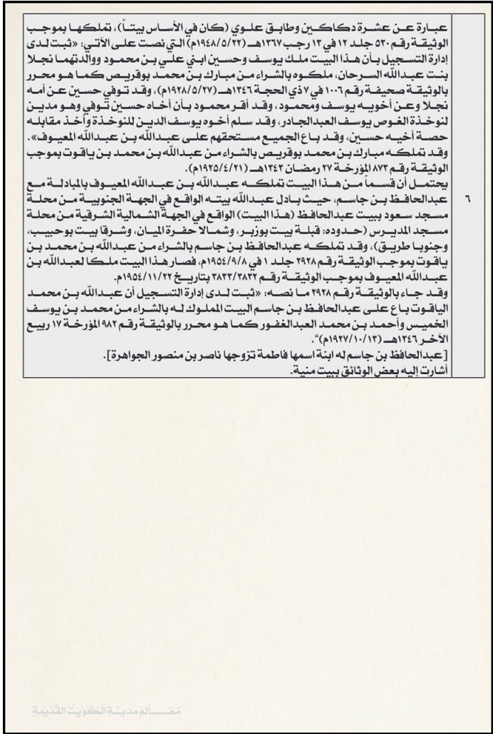 رقم 15 تملكه ( حمد بن معيوف بوقريص ) بموجب الوثيقة رقم 821 جلد في 12 ربيع أول 1343 هجري ( 1924/10/11م) ، رقم 17 وقد باع ورثة ميثا وفاطمة بنات سعيد بن علي البيت على ( حمد بن معيوف بوقريص ) كما هو ثابت بالإعلام الصادر من المحكمة الشرعية في 23 جمادي الأول 1362 هجري ( 1943/5/28م) ، وقد باع ورثة مريم ( وهم أولادها يوسف وفاطمة وعيسى أولاد السيد عبدالله الحنيان ) مستحق أمهم على حمد بوقريص كما هو ثابت بالإعلام الصادر من محكمة الشرعية في 30 جمادي الأولى 1358هجري ( 1939/7/18م ) قائمة بملاك قسائم محلة الزبن والربان في حي الوسط