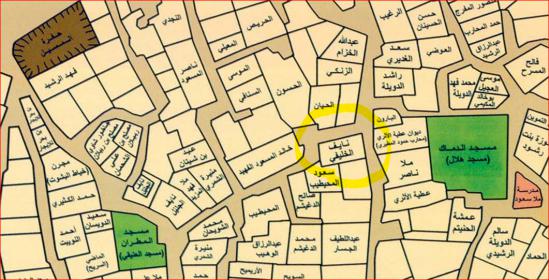 وفي الصورة المرفقة جزء من الخريطة الموجودة في موقع معرفي http://marafi.com/1951-Map حيث يوجد منزل نايف محمد النايف الخليفي.