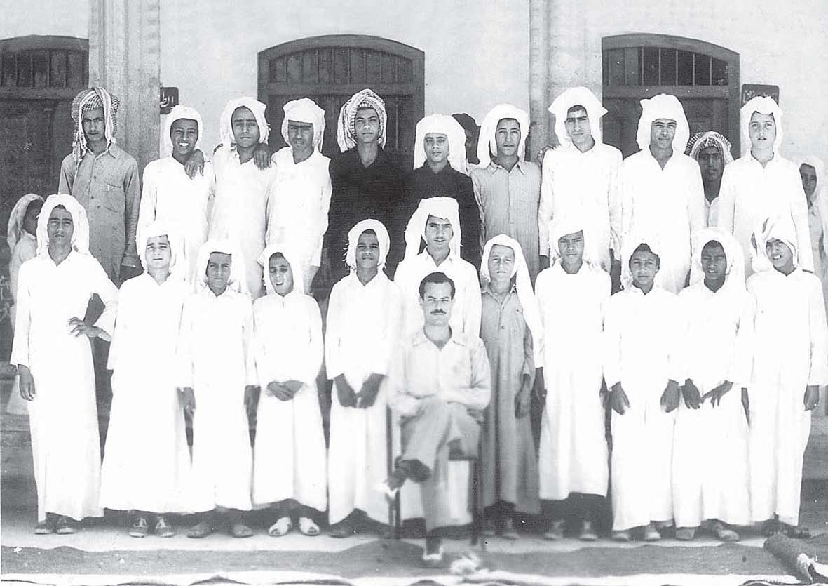 الصف الثاني: بدر ناصر بورسلي، جاسم فضالة، محمد صالح الرومي، غريب محمد، علي حيدر، بدر العيسى، غريب الغريب، علي سعدون البدر، يعقوب الجوعان، عبدالرحيم بستكي، عبدالوهاب التمار، ويتوسط التلاميذ في الصف الاول الاستاذ محمد زعبلاوي.