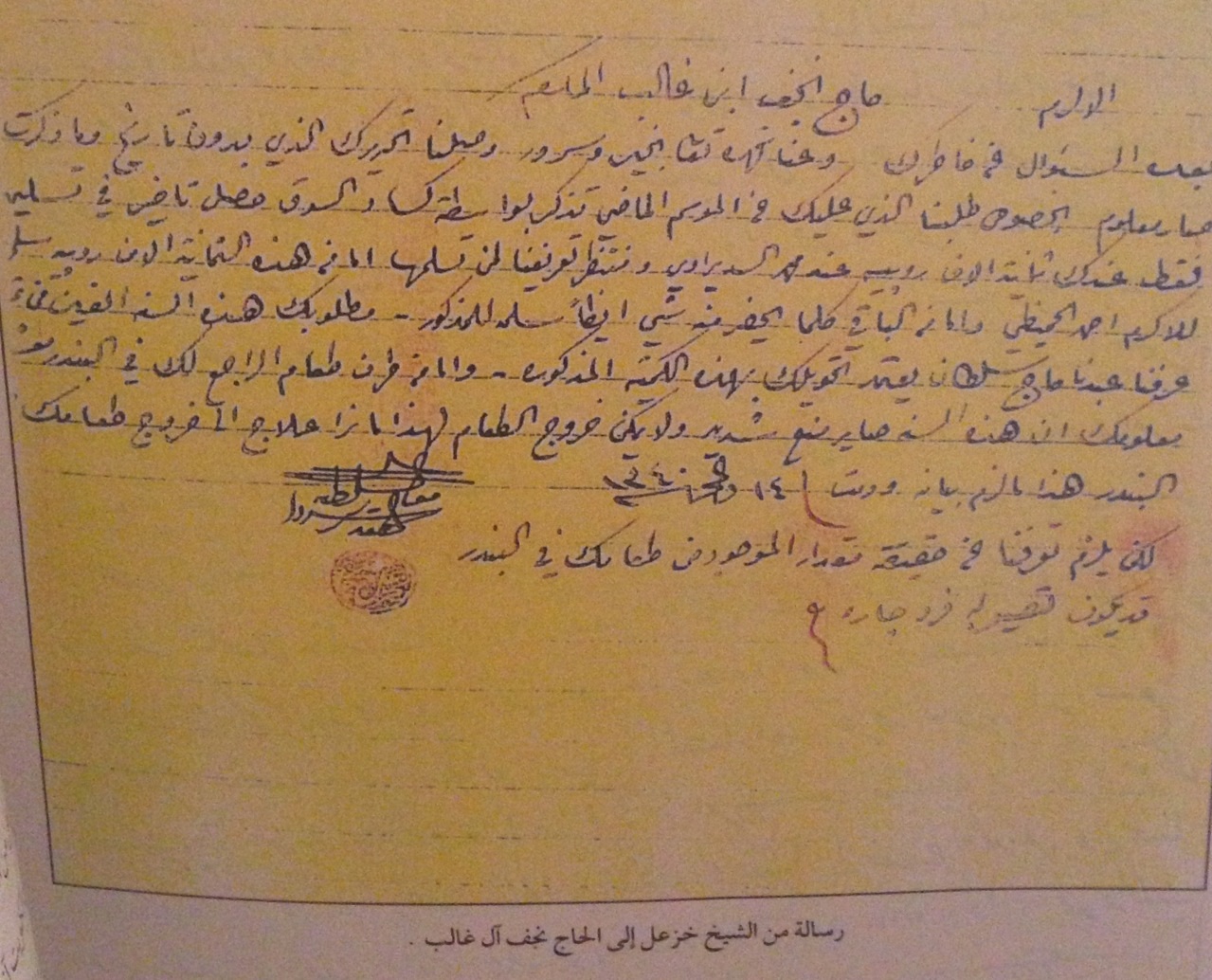 (1) رسالة من الشيخ خزعل الى الحاج نجف بن غالب رحمهم الله