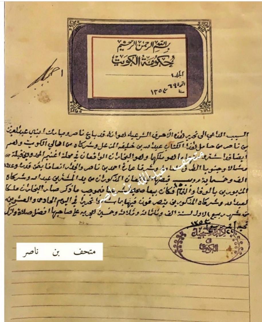 وثيقة عام ١٩٣٥م مصدقه من قبل حاكم الكويت الشيخ احمد الجابر الصباح بيع البخاران ملك النوخذة ناصر عبدالعزيز بن ناصر ، والنوخذة مبارك عبدالعزيز بن ناصر الواقعان في محلة آل غنيم فريج الغنيم الحي القبلي (جبلة) بجانب عمارة النوخذة احمد بن ناصر.