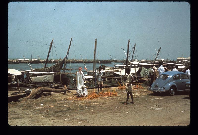صورة للفرضة ( سوق الميناء ) الكويت 1977 و يبدو بائع البلح يرتب معروضه من البلح ( البرحي )..و سفن و قوارب النقل و الصيد ...