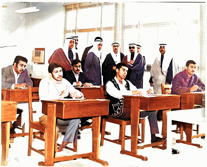 يظهر في الصورة من اليمين فيصل المخيزيم ونخيلان النخيلان ومهدي بهبهاني ومن اليسار يونس بارون والأستاذ خالد عيد وعلي سعود المطرود ورضا دشتي الصورة في أواخر الستينات